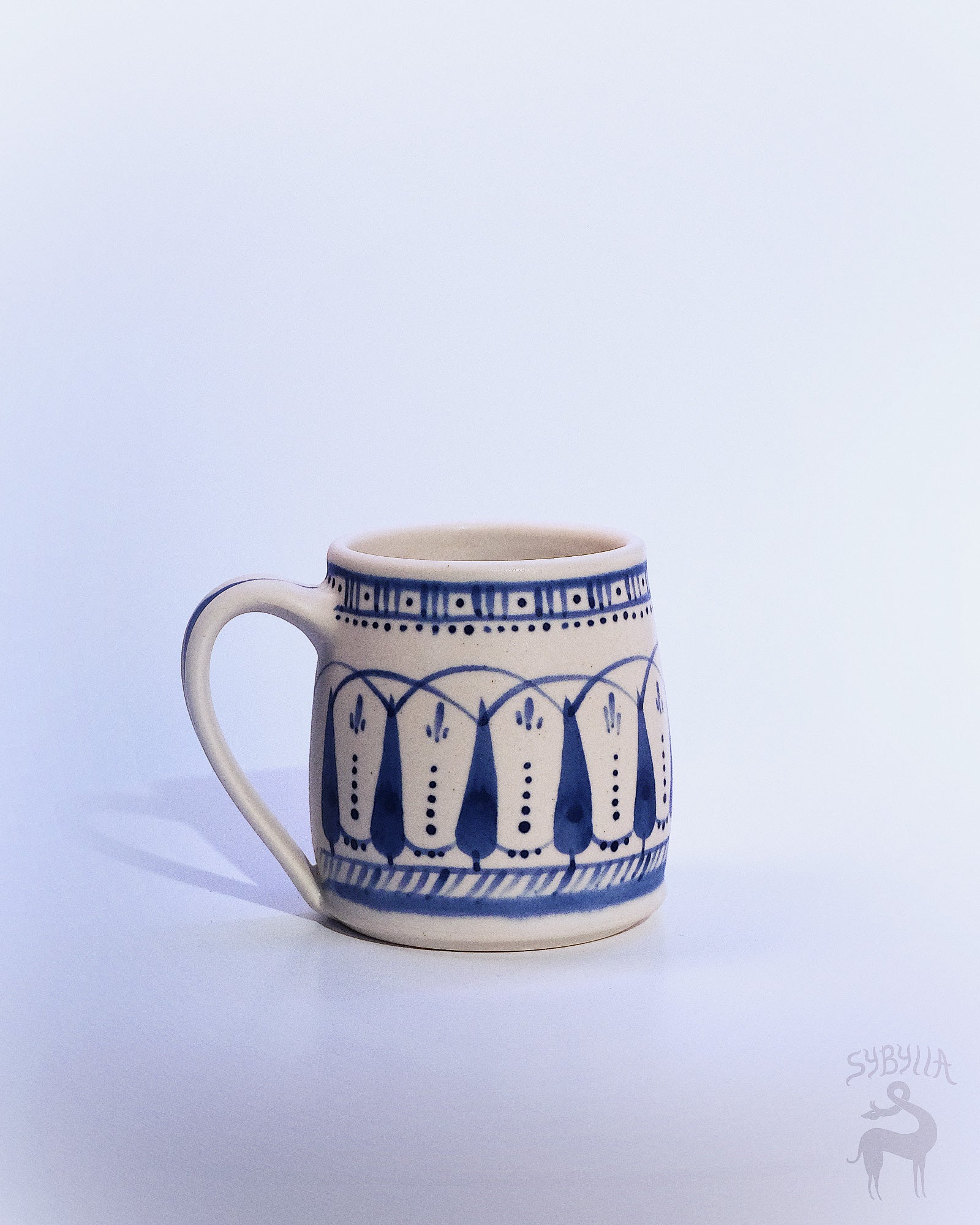 10oz mug, lovingly hand painted in cobalt blue with Etruscan motifs.