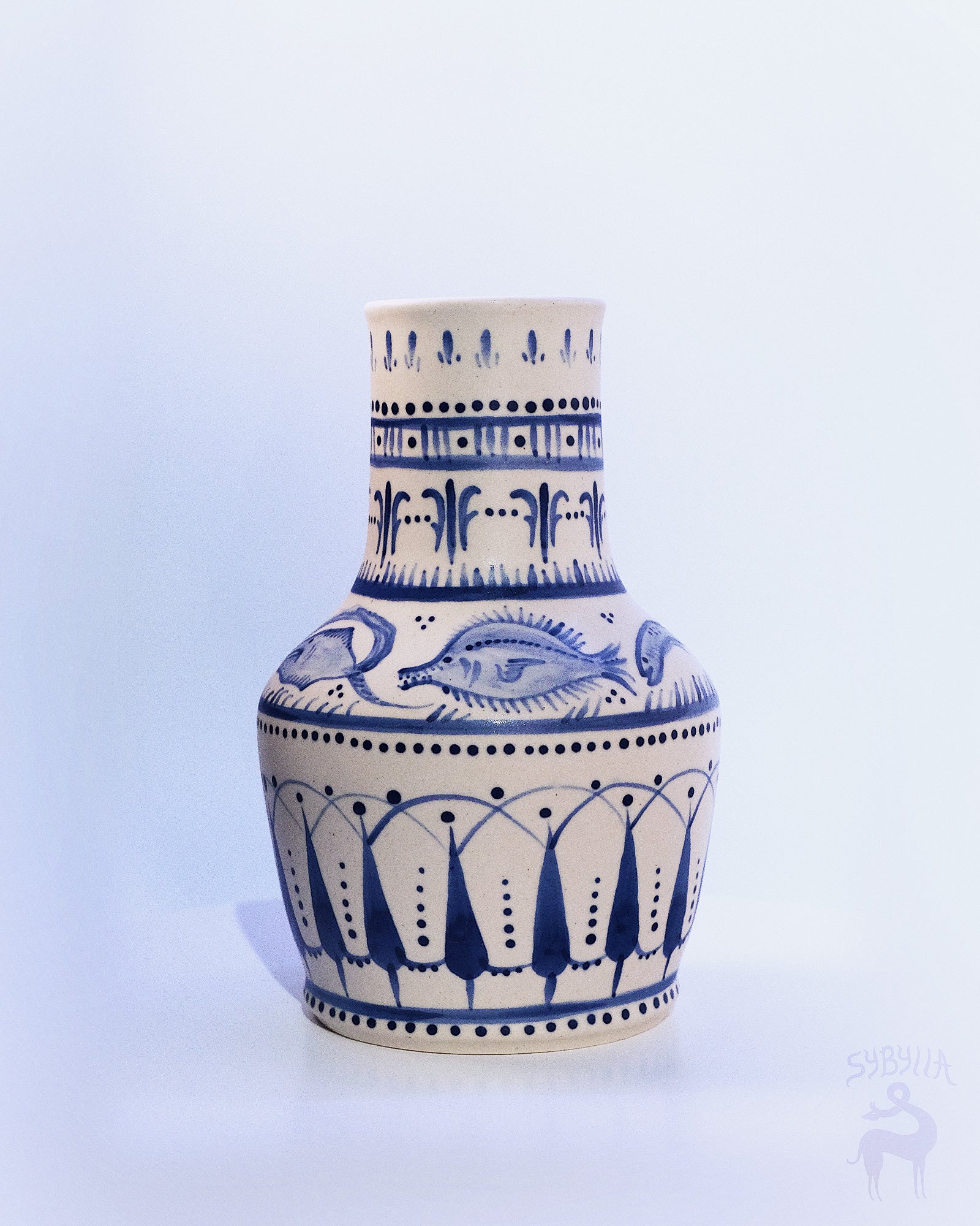 Weird and wonderful vase hand-painted with cobalt blue Etruscan motifs and fantasy fishes. A very fishy 8 inches tall.
