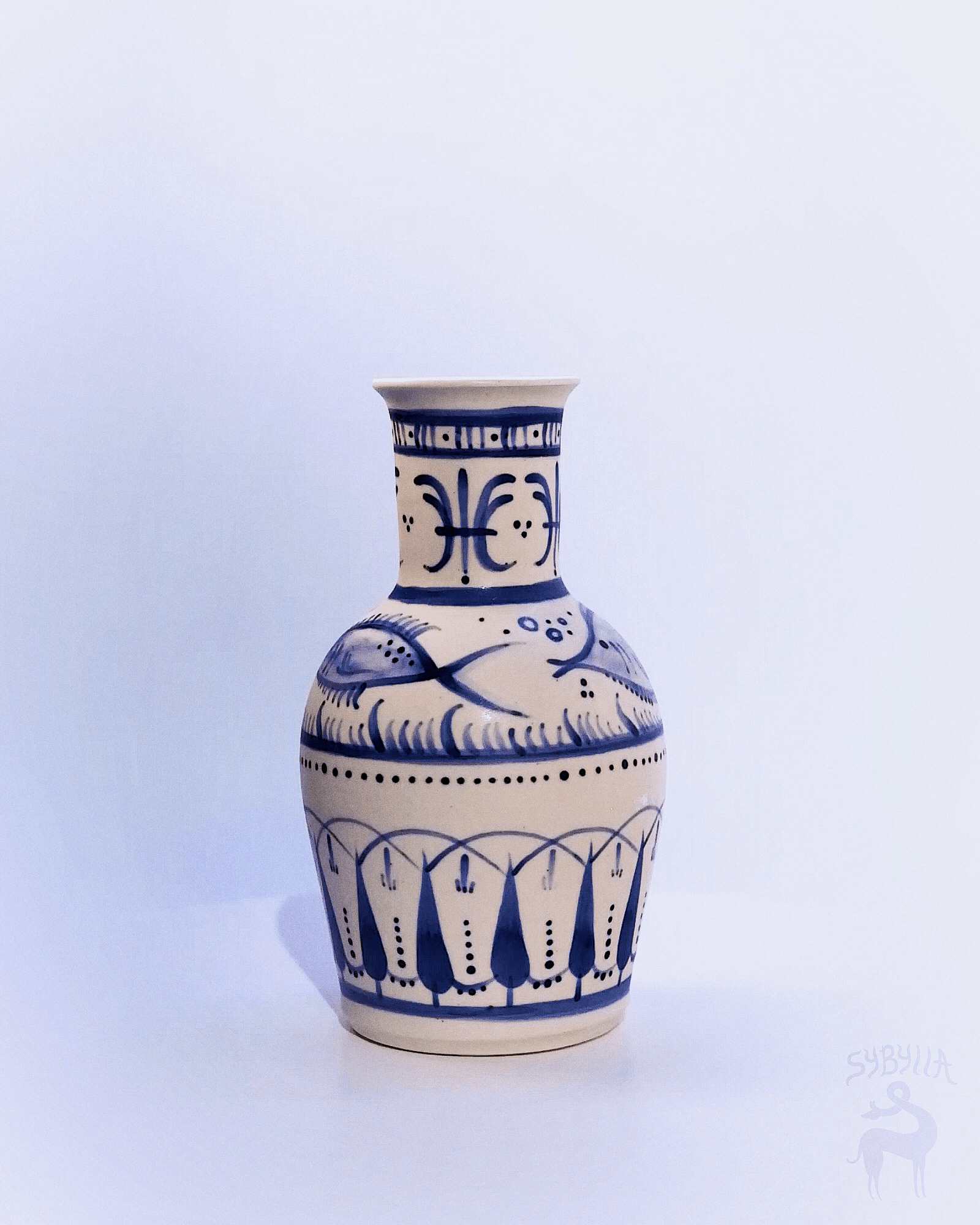 A very joyful little vase that is hand -painted with cobalt blue Etruscan motifs and happy little fishes. A delightful 7.7 inches tall.