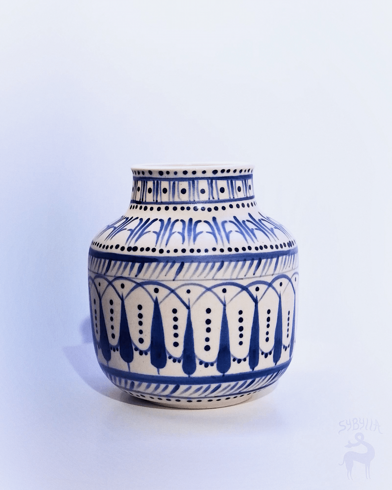 A very proper vase that is hand painted with cobalt blue Etruscan motifs. It's really quite nice, I must say. You could totally give this to your mom. A respectable 6 1/2 inches tall.